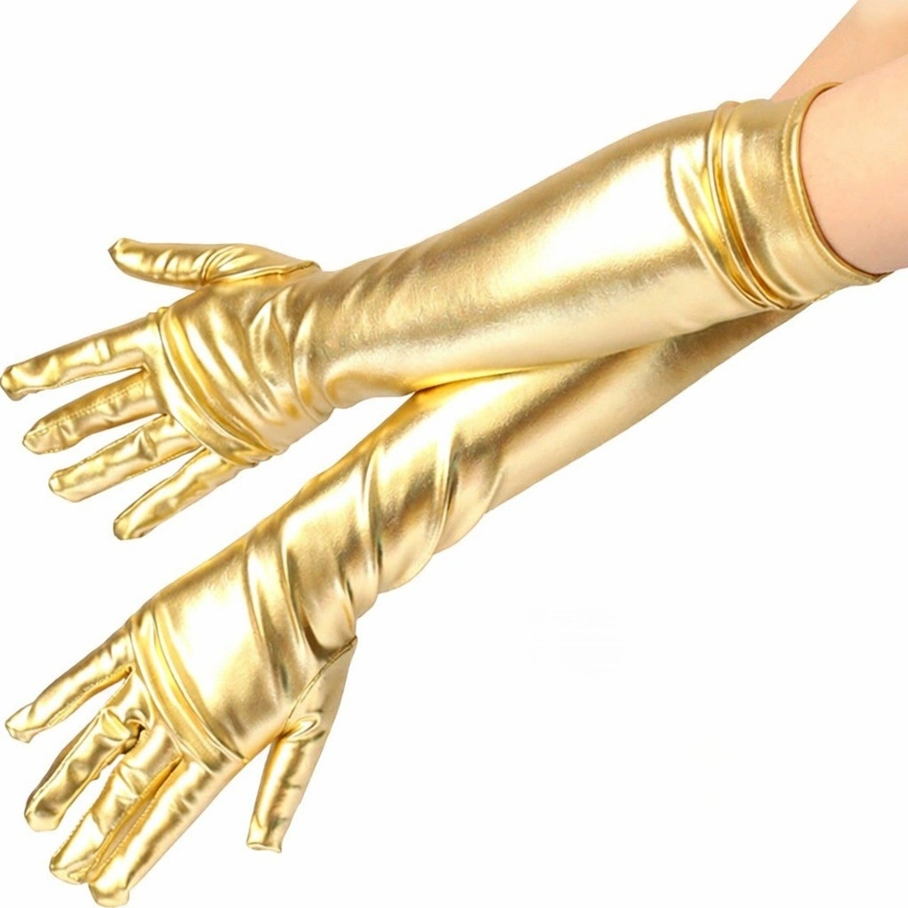 Şık ve dikkat çekici tasarımıyla 40 cm altın saten eldiven, dirsek altına kadar uzanan yapısıyla kostüm ve sahne kombinlerinin vazgeçilmez tamamlayıcısıdır. Parlak saten kumaşı sayesinde ışığı yansıtarak göz alıcı bir görünüm sunar.